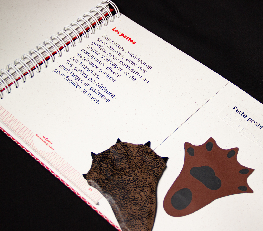 Réécriture du texte présentant le castor dans le bassin de la Loire : ses particularités, son anatomie, son mode de vie, son histoire, etc. Adapté pour tout public. Ce livre est en braille, gros caractères et illustrations tactiles. Il est exposé à la maison de la Loire d’Indre et Loire, et dans des médiathèques locales.