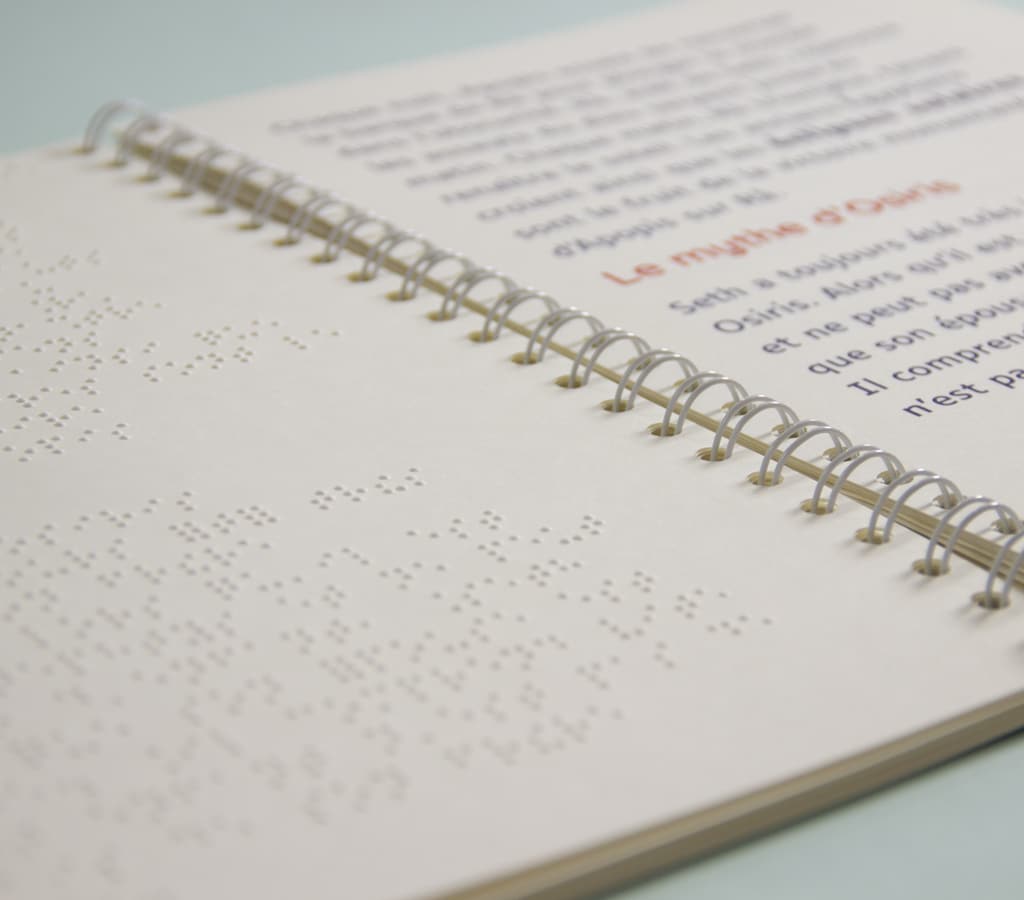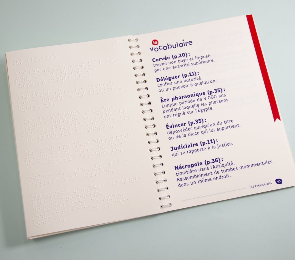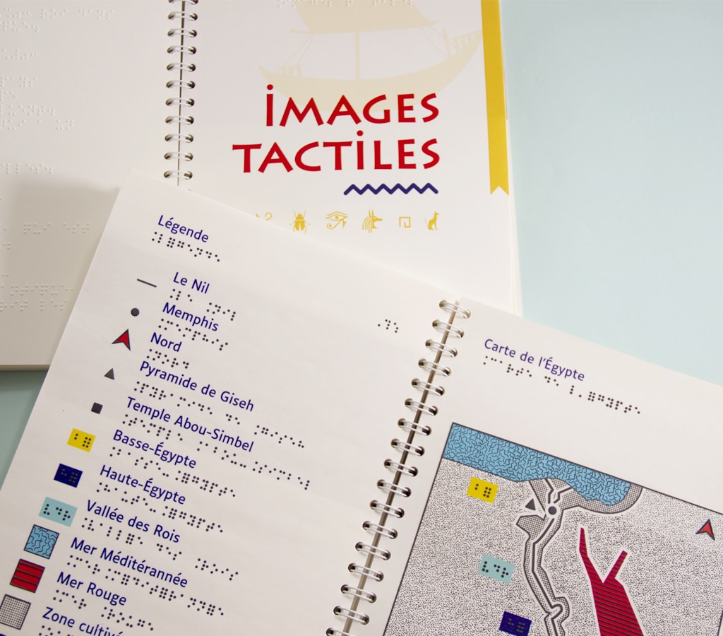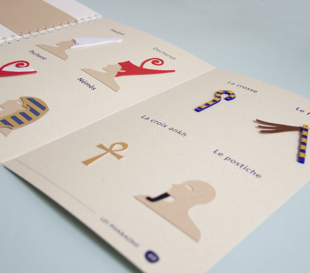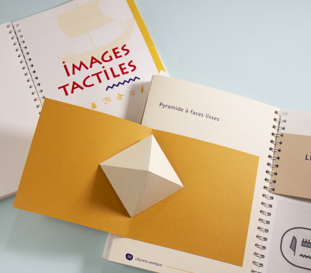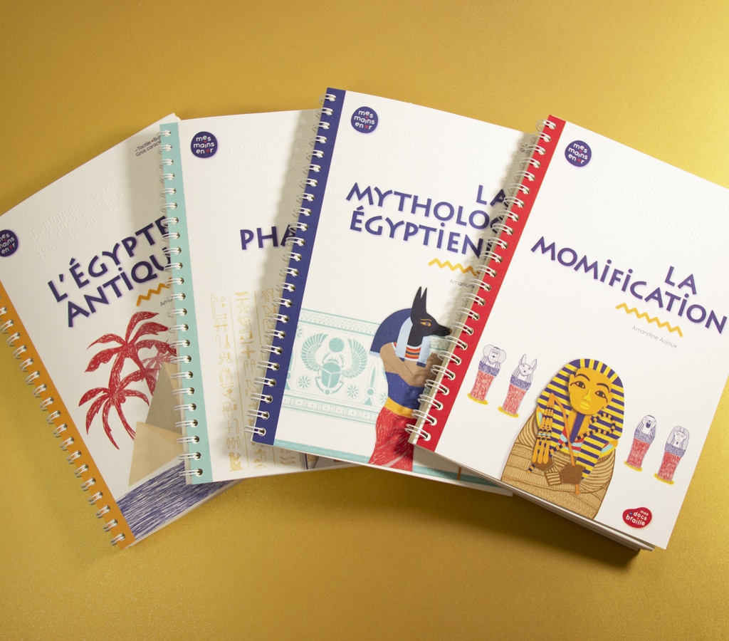 Quand on parle de l’Égypte antique, on imagine les temples et leurs fresques, les pyramides, les hiéroglyphes… Mais comment se représenter tout ça lorsqu’on est aveugle ou malvoyant ? Ce coffret documentaire de 4 livres est accessible aux enfants déficients visuels grâce à un texte en gros caractères et en braille, et des illustrations tactiles et pop-up.