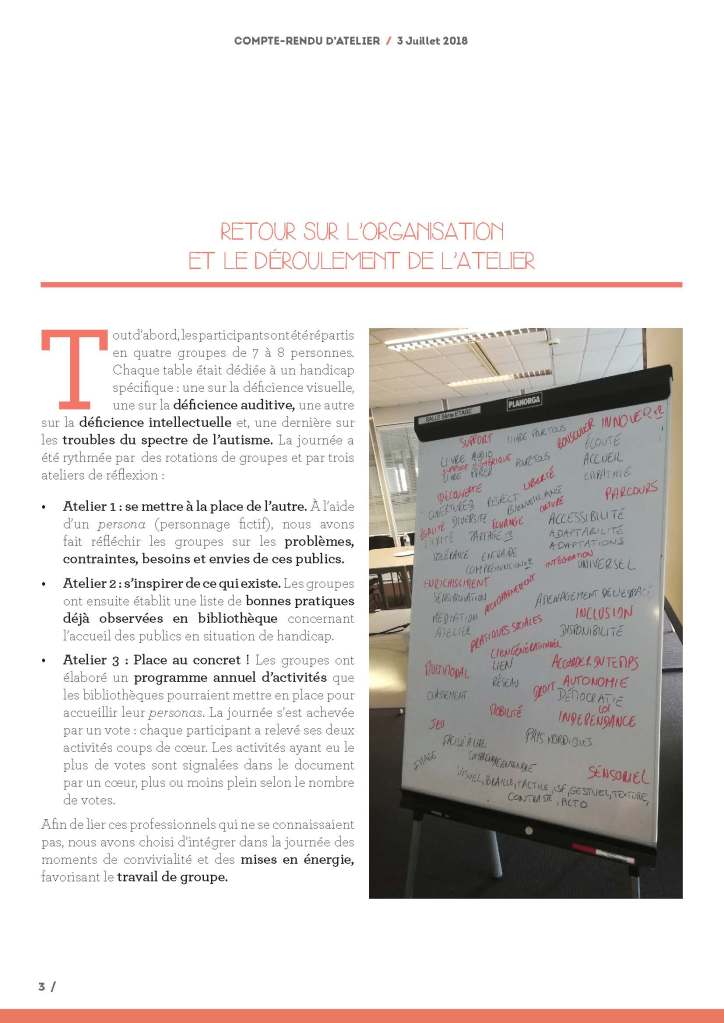 Organisation d’ateliers interprofessionnels sous le format d’une journée de co-design autour de l‘inclusion des personnes en situation de handicap dans les médiathèques. Coordination, préparation, facilitation et animation, prise de notes, rédaction d’un compte-rendu détaillé de la journée.